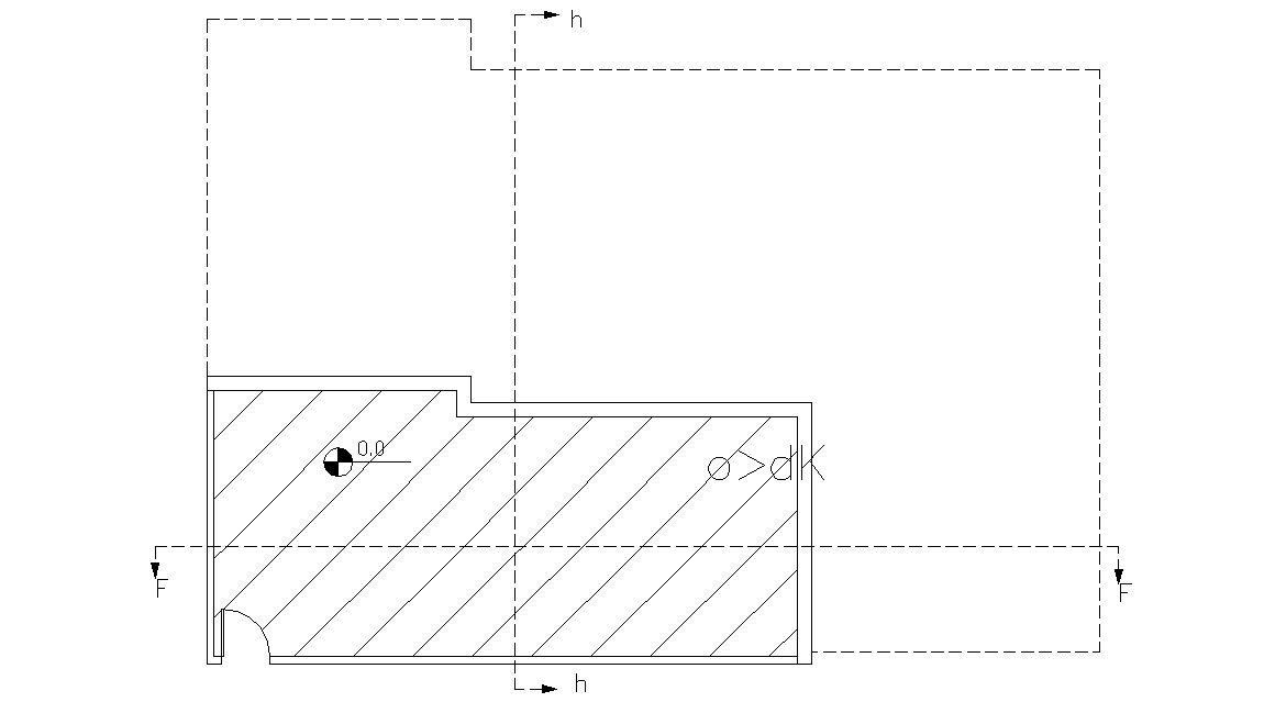 architectural drawing of simple single rooms plan with section line. peripheral dotted line in plan.some hatching design in room.
