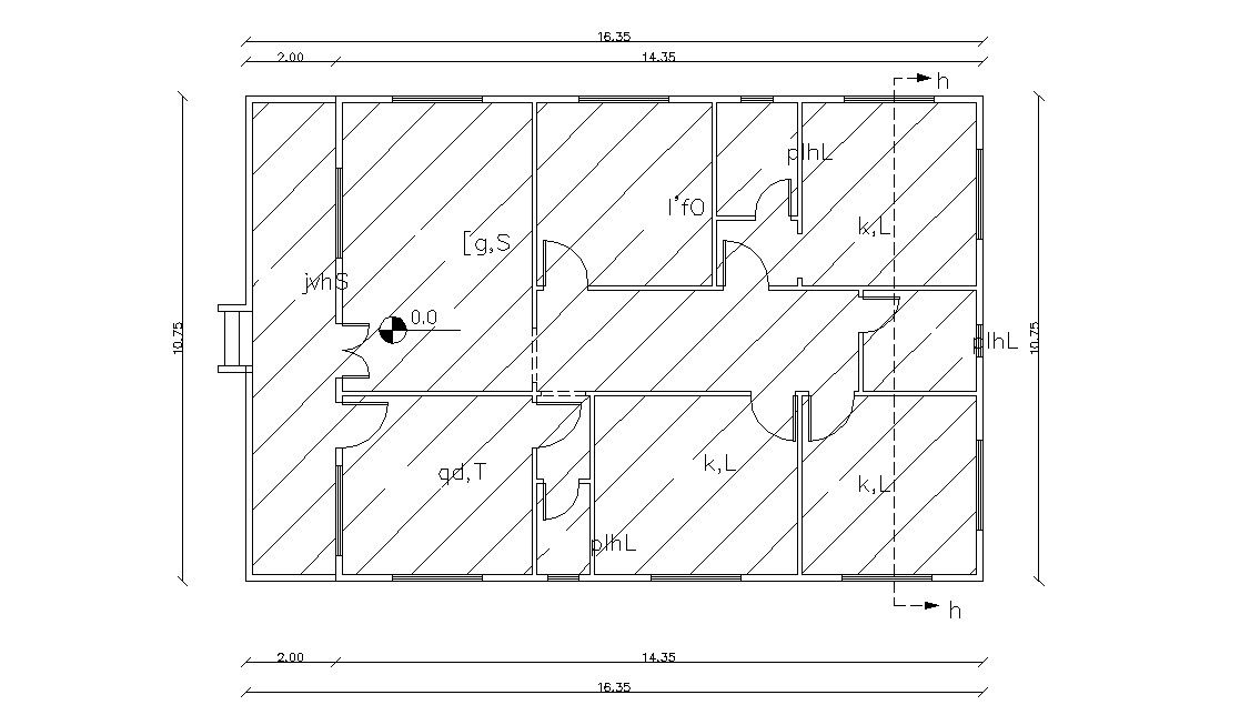 floor plan of the modern architectural design of the house with dimension details, some hatching design in plan, doors, and windows marking in the plan, in this drawing added drawing room, living room, bedrooms, toilets, kitchen, main huge foyer, and other more details in it.