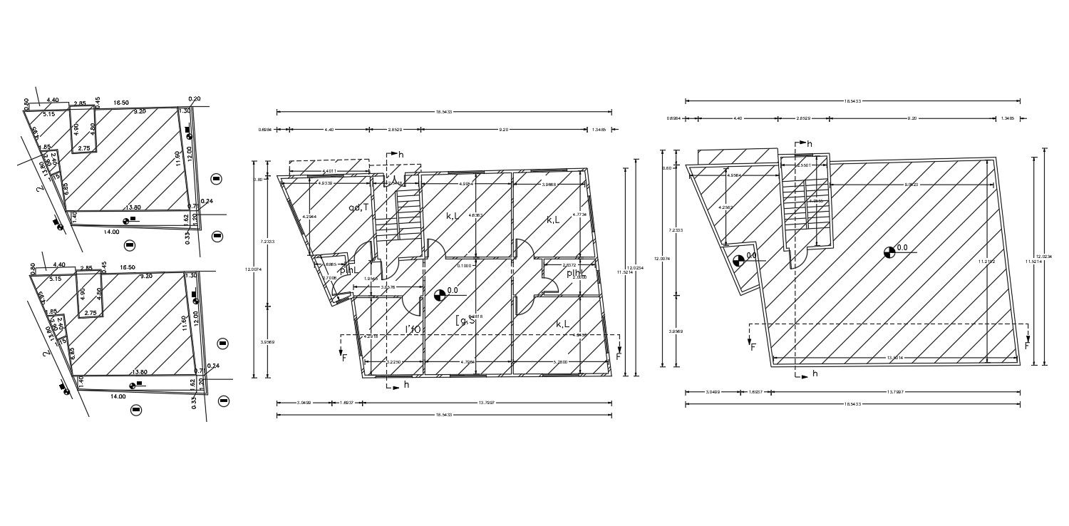 2d CAD drawing of house floor plan design includes 3 bedroom, kitchen, drawing room and living area with dimension detail. plot and land survey with AutoCAD hatching design.