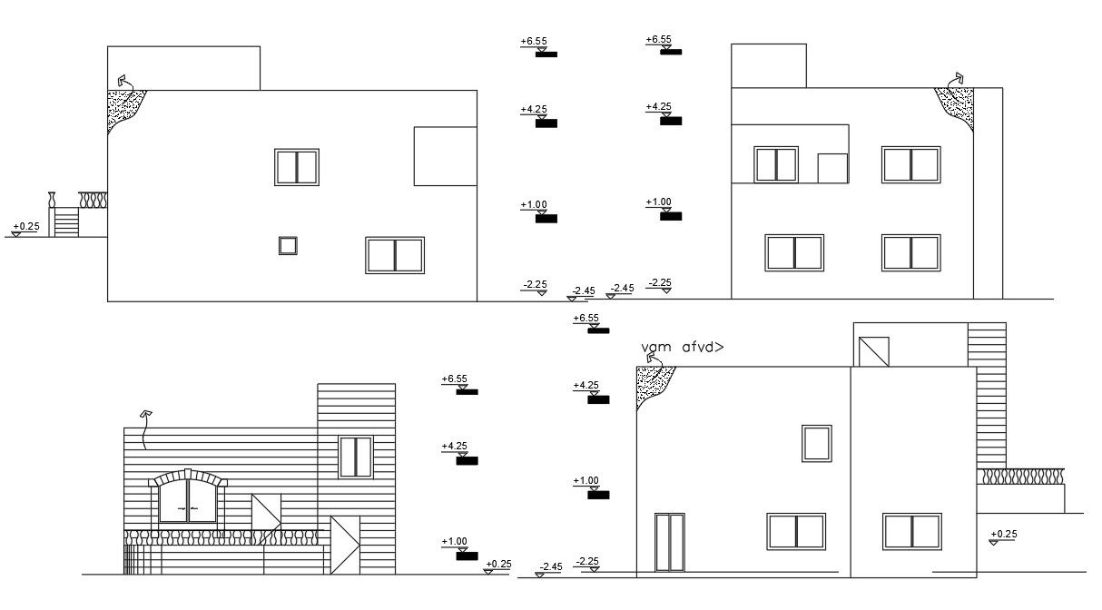 Download free DWG file of house building elevation design which shows the number view in all side. download DWG file of house building design AutoCAD drawing.