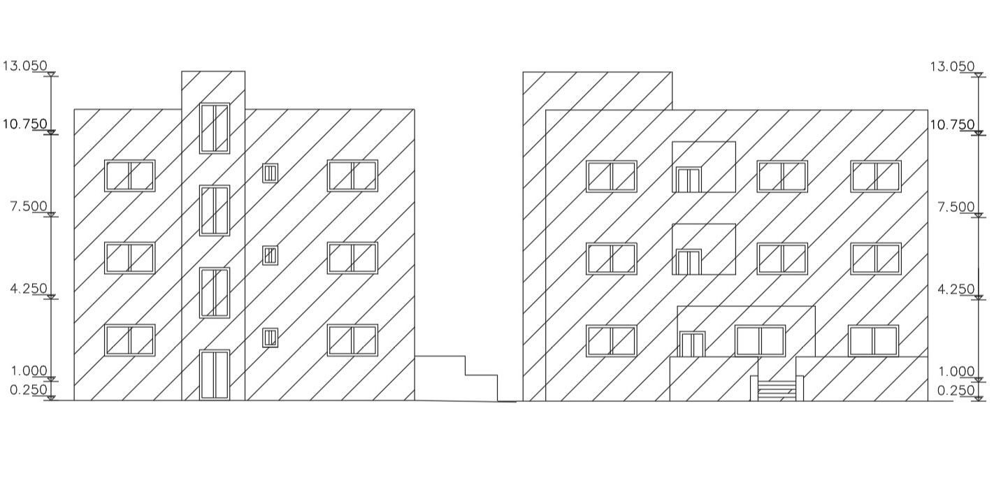 2d CAD drawing 3 storey apartment side and front elevation design with dimension detail and AutoCAD hatching design.