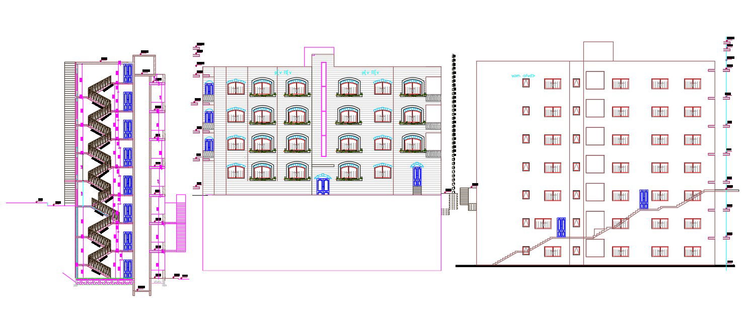 The architecture apartment building sectional elevation design which is the number of different angle view design that shows standard staircase, front elevation door and window marking with dimension detail. download DWG file of house building design AutoCAD drawing.