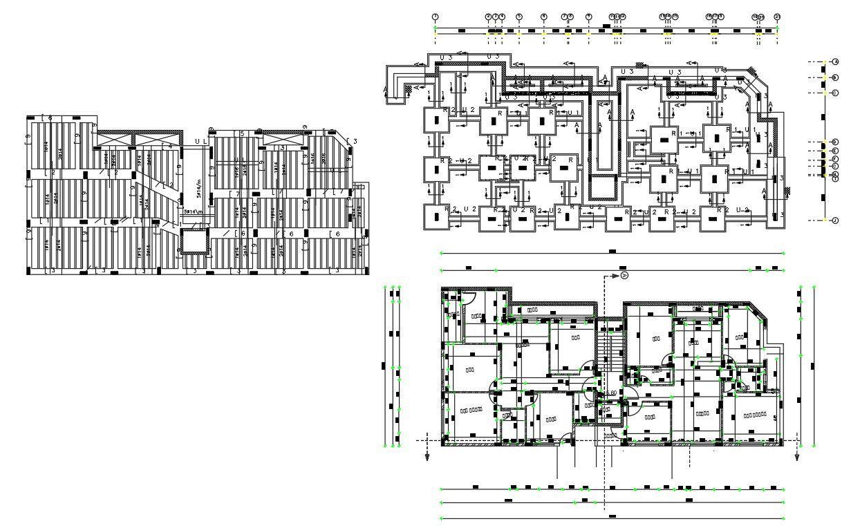 2d CAD drawing of 3 bedrooms apartment house typical floor plan design that shows foundation column, excavation plan and reinforcement slab bar structure design. download 3 BHK apartment plan with construction working plan.