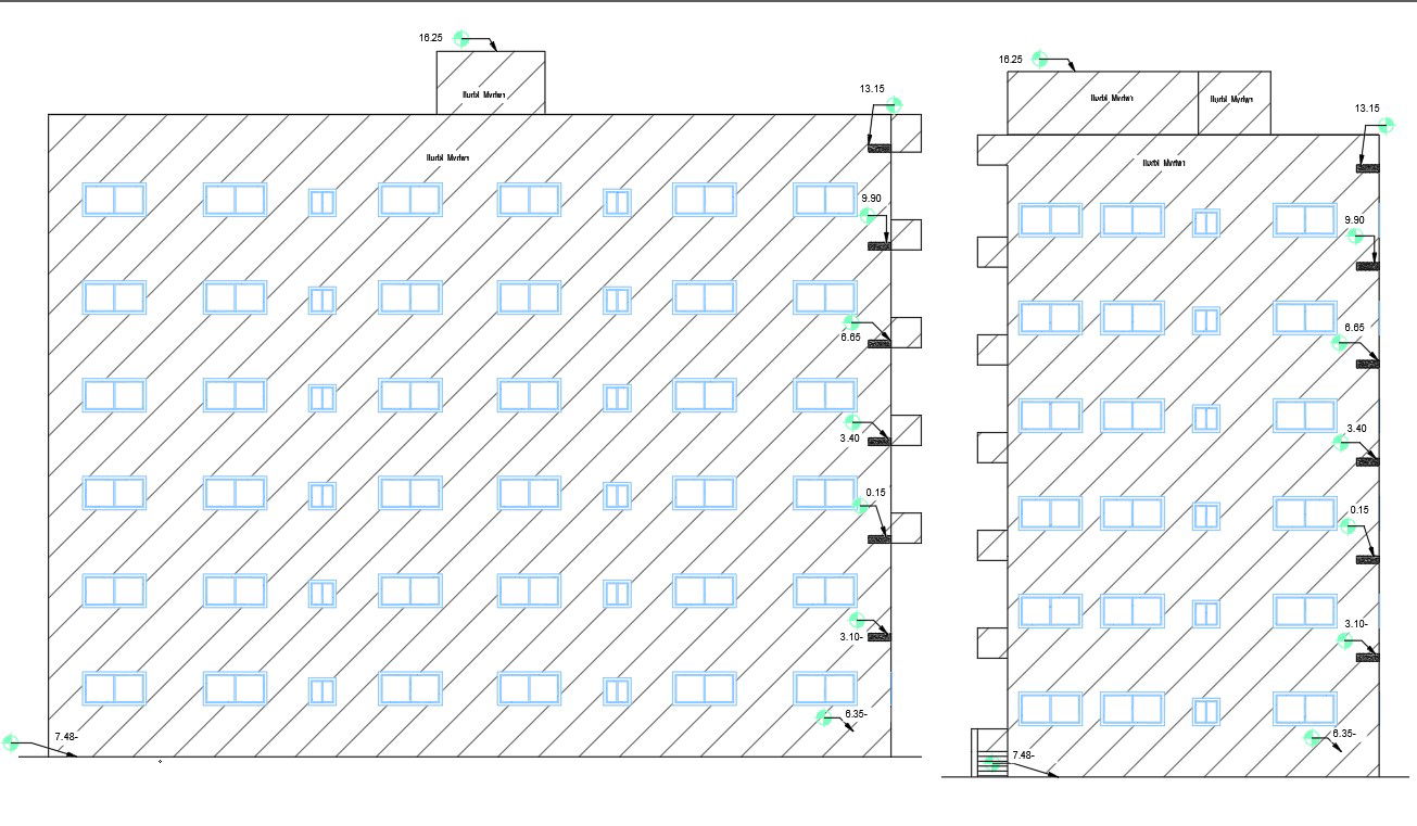 Download free DWG file of apartment building elevation design with dimension detail which shows the 6 storey floor level and window marking detail.