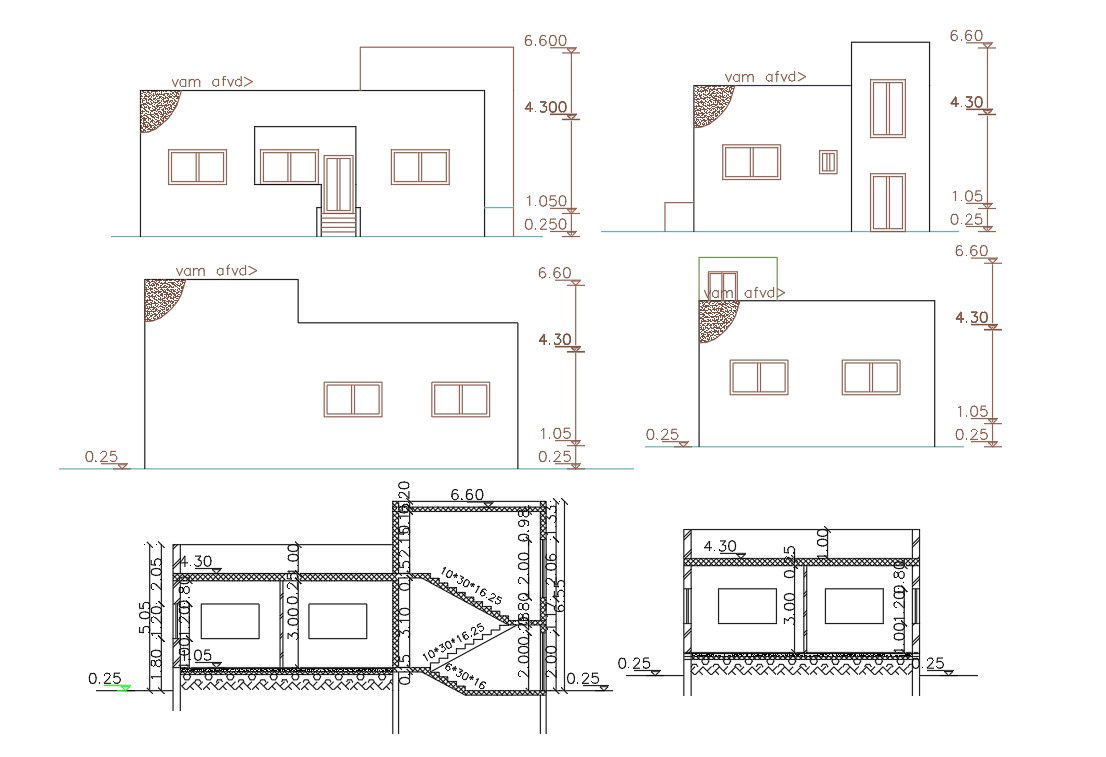 find here single storey house building all side elevation design and section drawing which shows RCC floor slab, staircase and wall section with all dimension detail. download DWG file of modern house sectional elevation design.