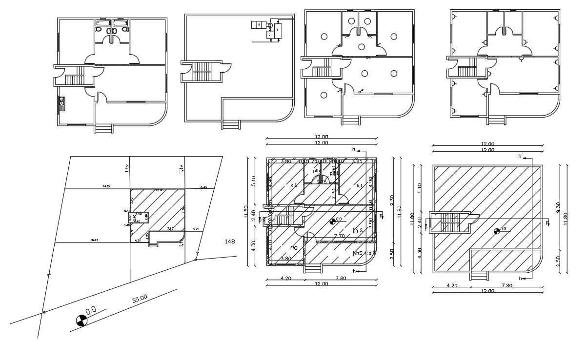 35X40 feet house plan plot size AutoCAD drawing shows ground floor plan and terrace plan design with dimension detail, sanitary ware and electrical point layout plan. download 1400 Sq ft 2 bedroom house plan with final plot land survey hatching design.