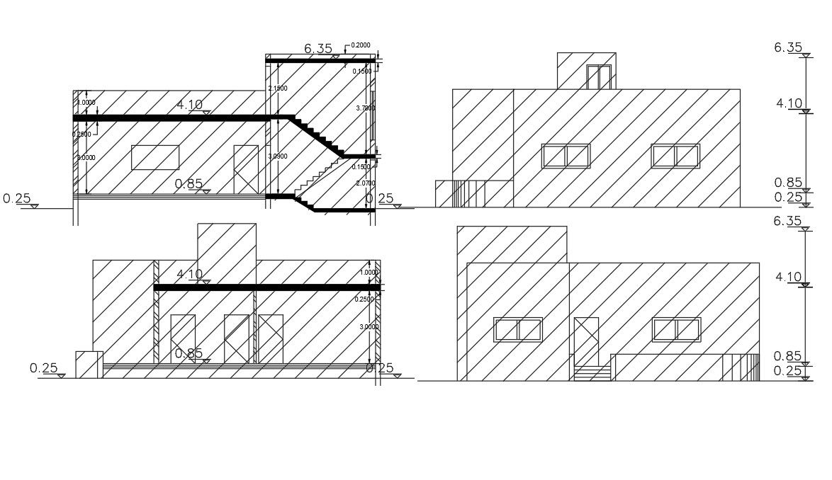 The single storey house building sectional elevation design which is the number of different angles view design with dimension detail and RCC slab design. download house building AutoCAD design.