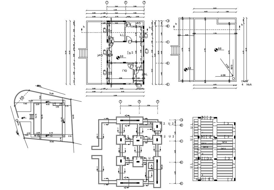 2 bedroom house floor plan design AutoCAD drawing shows 25 feet by 40 feet house plot land area survey detail with compound all design. also has column footing, excavation plan, and reinforcement slab bar structure design of house construction plan. download 2 BHK house plan design DWG file.