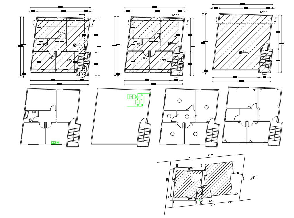 2d CAd drawing of the ground floor, first-floor plan and terrace top view design include 2 bedrooms, kitchen and drawing room with general toilet on a single floor. also has sanitary ware detail and electrical layout plan design. download DWG file of house plan with site plot land survey detail.