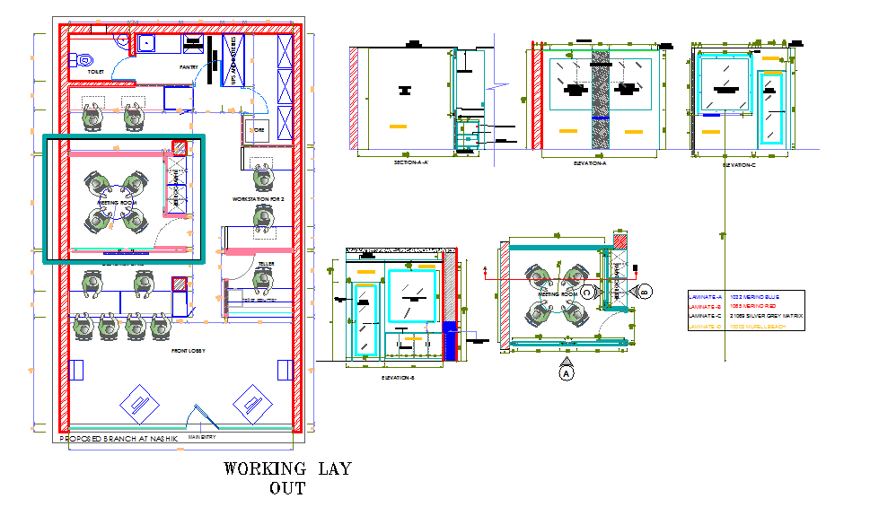 This office detail in meeting room, working station 1, & 2, Manager cabin, & toilet design, Elevation & section nclude the drawing.