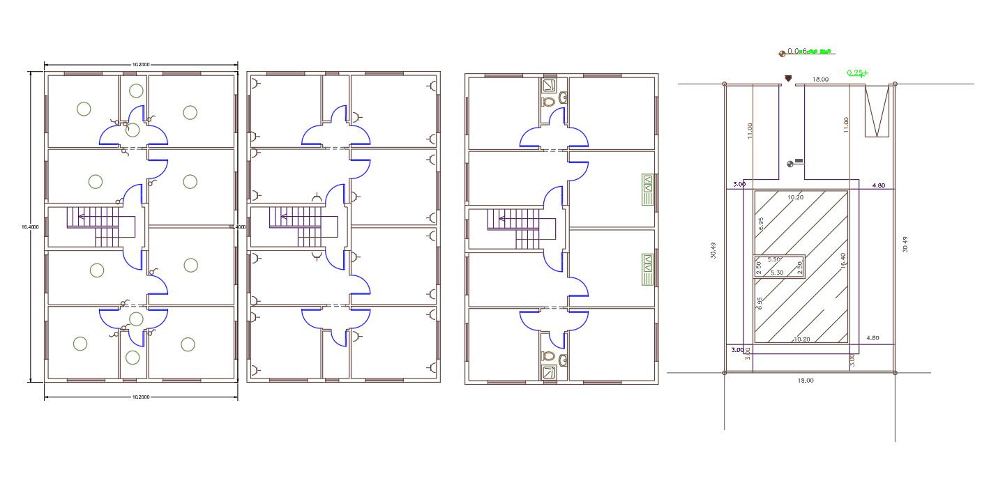 1600 SQFT apartment house plan AutoCAD drawing includes sanitary ware detail, electrical plan, and wiring plan with switchboard and ceiling light point. download 32' X 53' feet apartment cluster plan design DWG file.