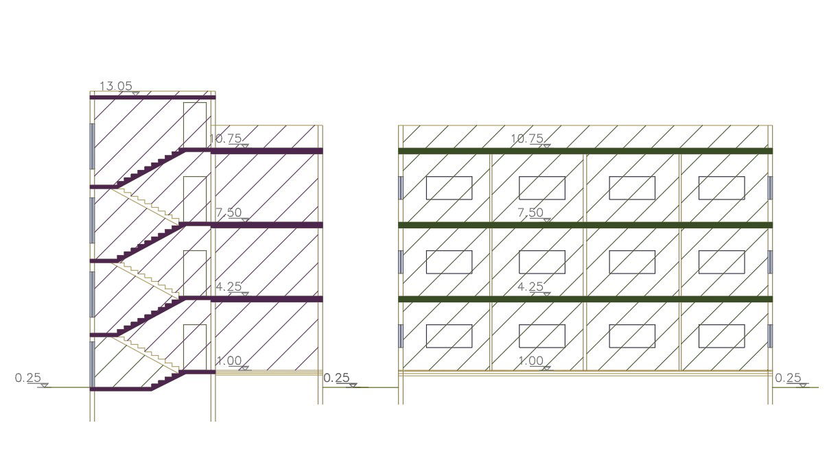 3 storey apartment building section drawing shows RCC standard staircase, slab, and wall section with dimension detail. download DWG file small apartment building section drawing.