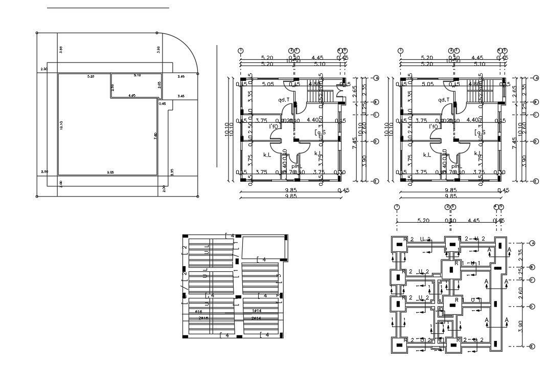 The architecture 2 BHK apartment house floor plan design CAD drawing includes a working plan of column footing with excavation layout plan, RCC slab bar structure design and site plan with all margin dimension detail mention in the meter.