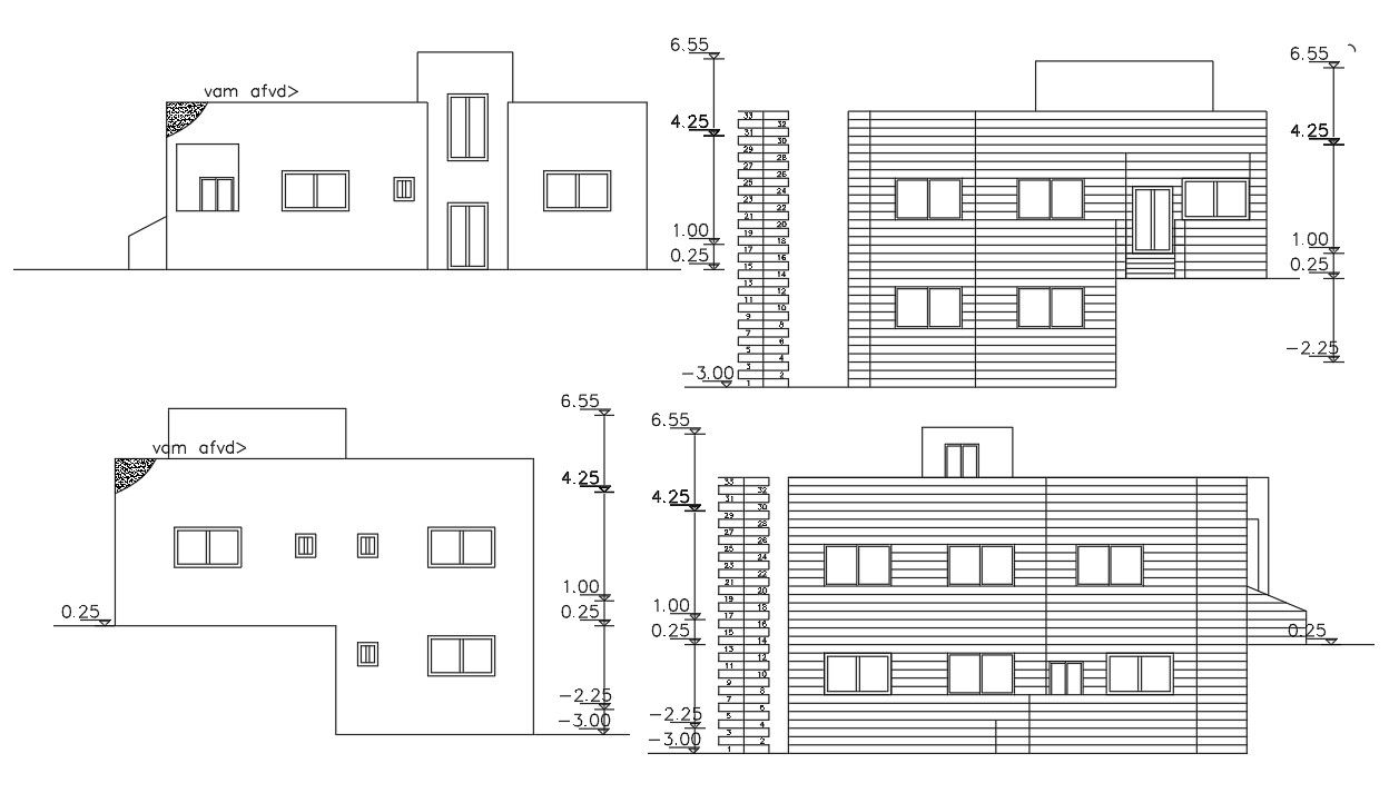 The architecture modern AutoCAD house building elevation design which shows number of different angles view design includes floor level, door and window marking design also has beautiful front elevation design of house building. download architecture house building design with dimension detail.