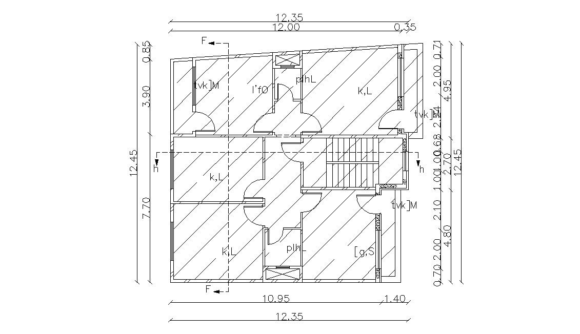 lavish huge bungalow planning with working drawing dimension details,some hatching details in plan.in this drawing added bedrooms,kitchen,stair,balcony,doors and windows marking in plan,section line in plan and other details in it.
