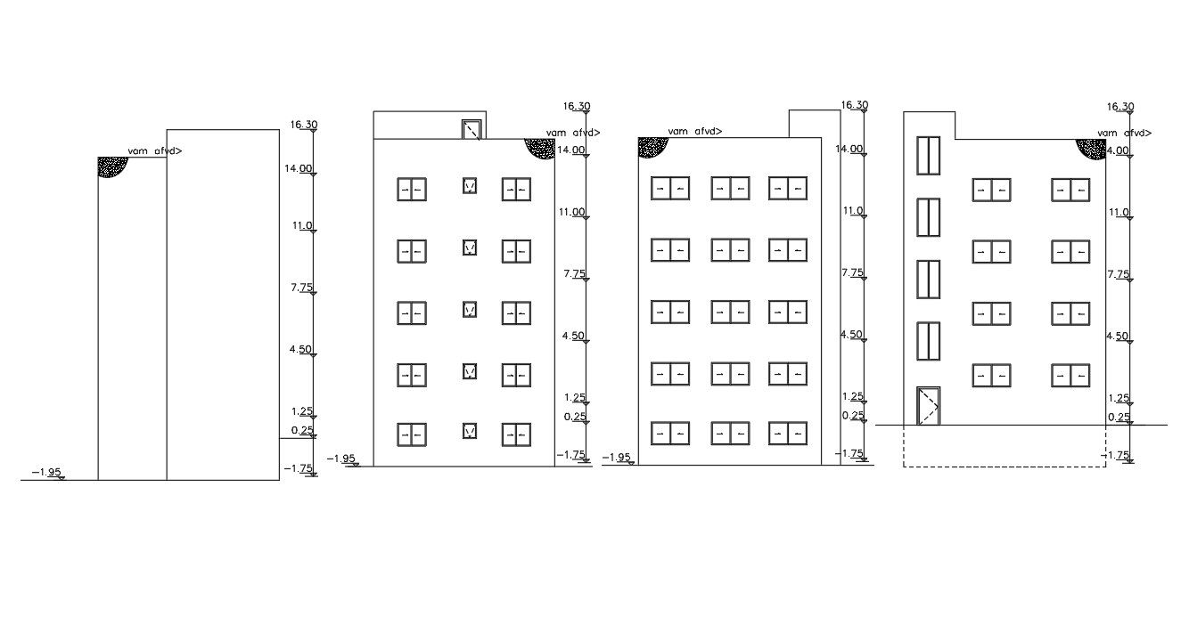 2d CAD drawing of 5 storey apartment building four side elevation design that shows the floor level building structure detail, door and window marking detail. download DWG file of apartment building design AutoCAD drawing