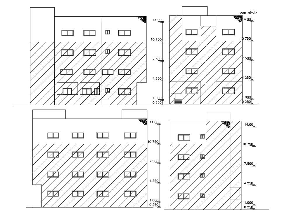 AutoCAD drawing of apartment building elevation design which shows four side elevation design, floor level detail, door and window marking that provides how its outdoor looks. download DWG file of 4 storey apartment building design.
