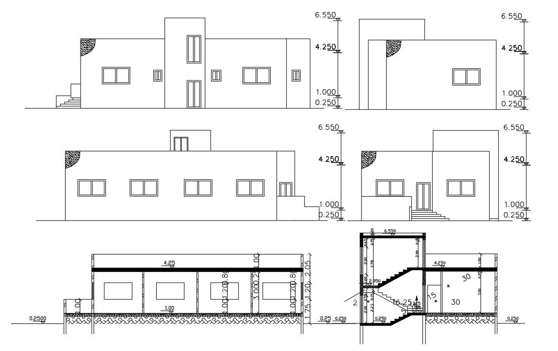 30 Feet by 55 Feet plot house building sectional elevation design in four sides that help to the visualisation of outdoor looks in AutoCAD drawing. download 30' X 55' feet 3 bedroom house design DWG file.