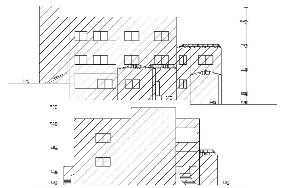 2d CAD drawing of architecture 4000 SQFT bungalow front and rear elevation design that help to the visualisation of outdoor looks in AutoCAD drawing with dimension detail. download DWG file of bungalow building design.
