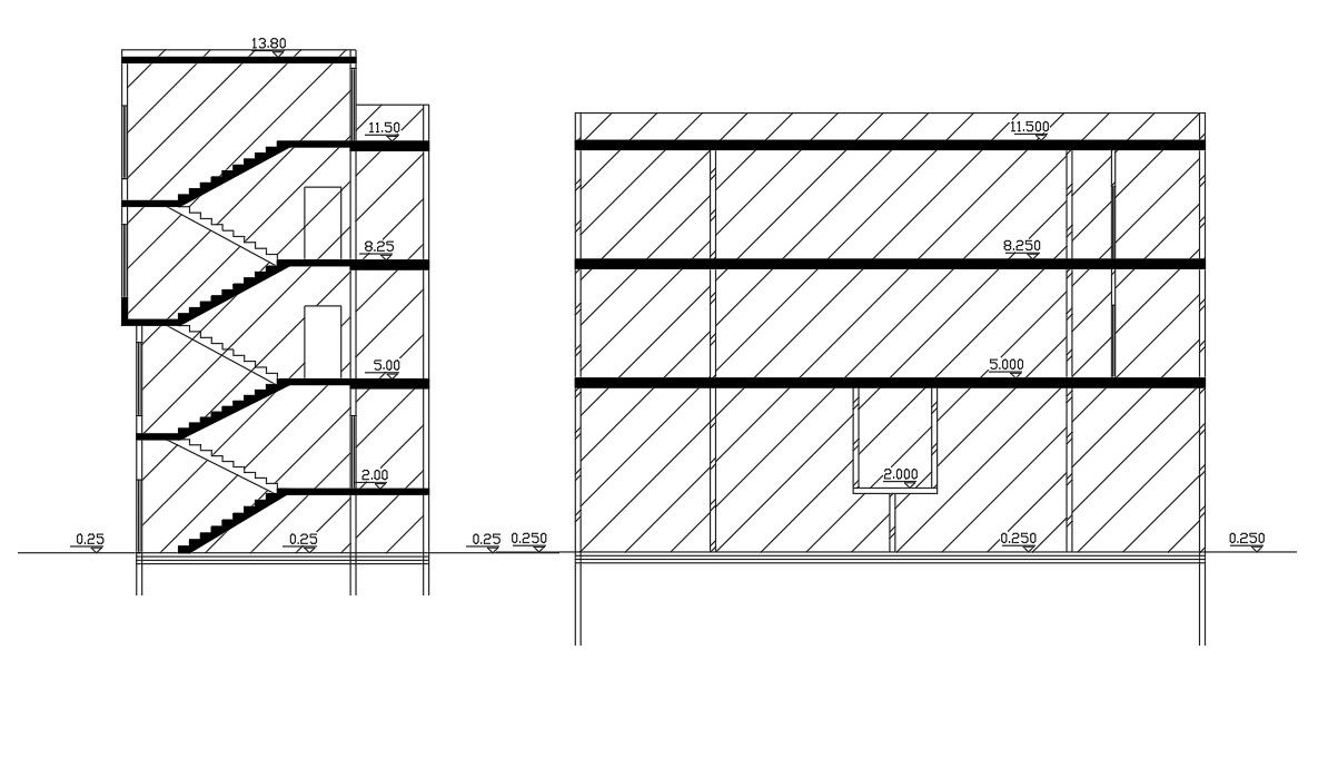 download free DWG file of apartment building section drawing that shows the shops on the ground floor and top 2-floor apartment house design with dimension detail.