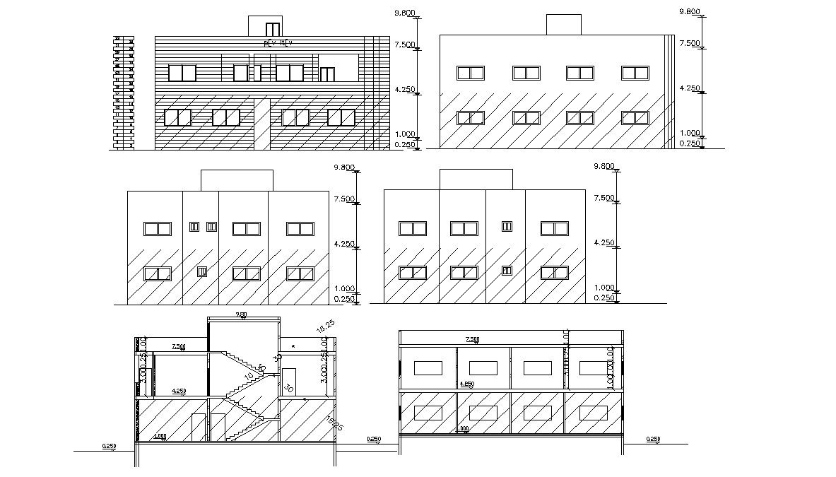 four side elevations and sections of residential building design with floor levels dimension details, hatching design in elevation, stair section, doors and windows marking in it. and other more details related to drawing free download this drawing.