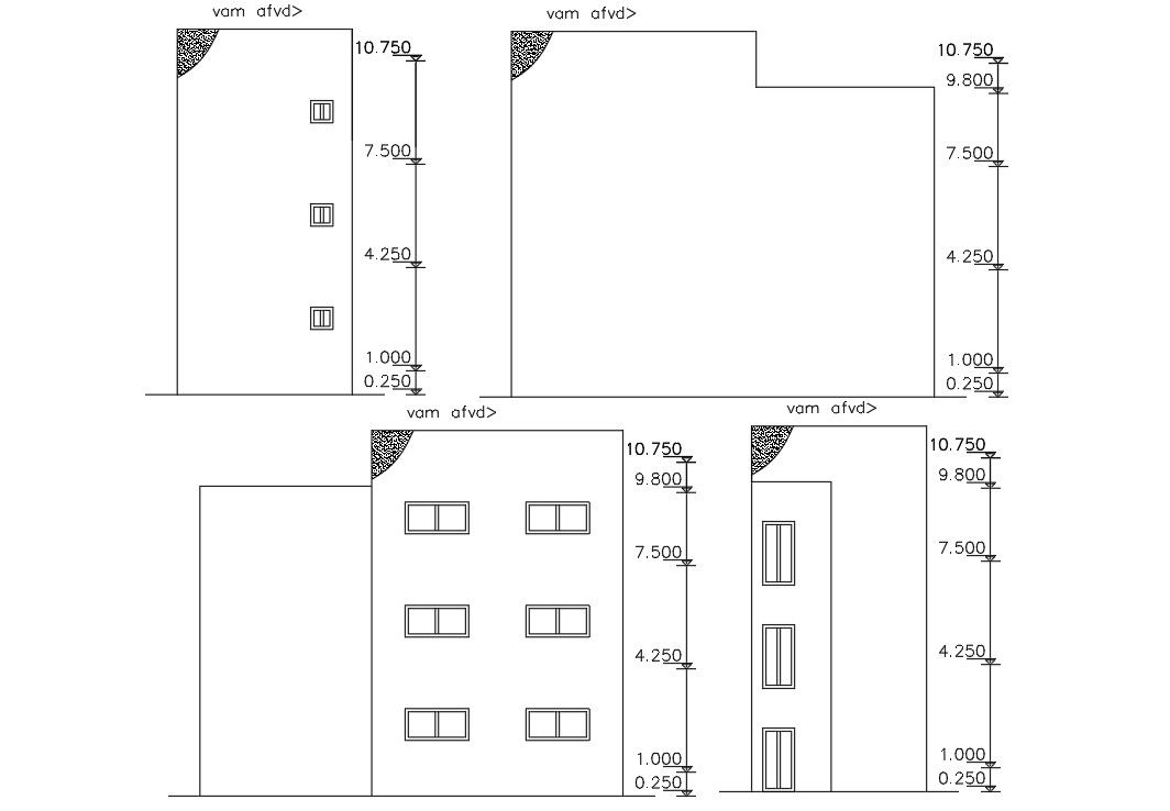 2d CAD drawing of 3 storey apartment building four side elevation design that shows the door and window marking with dimension detail. download DWG file of apartment elevation design.