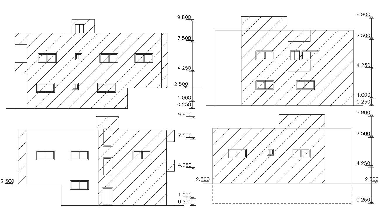 the architecture AutoCAD drawing of house building all side elevation design that shows how it looks after the completion of the building outdoor design. Download DWG file of 2 Storey house building design.