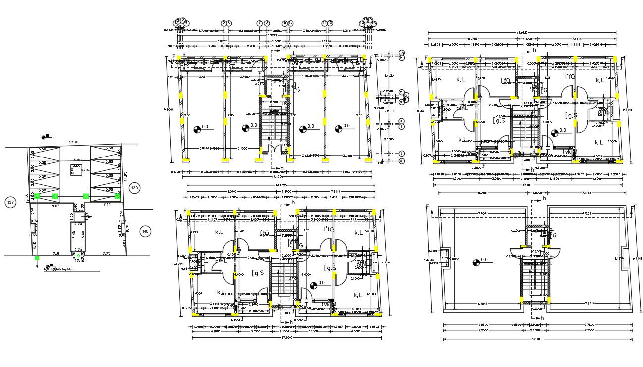 Architecture AutoCAD drawing of the apartment ground floor on the shop and top floor 2 BHK apartment house design with all dimension detail and column layout plan. also has ground floor 8 car parking space to accommodate with compound wall design DWG file.