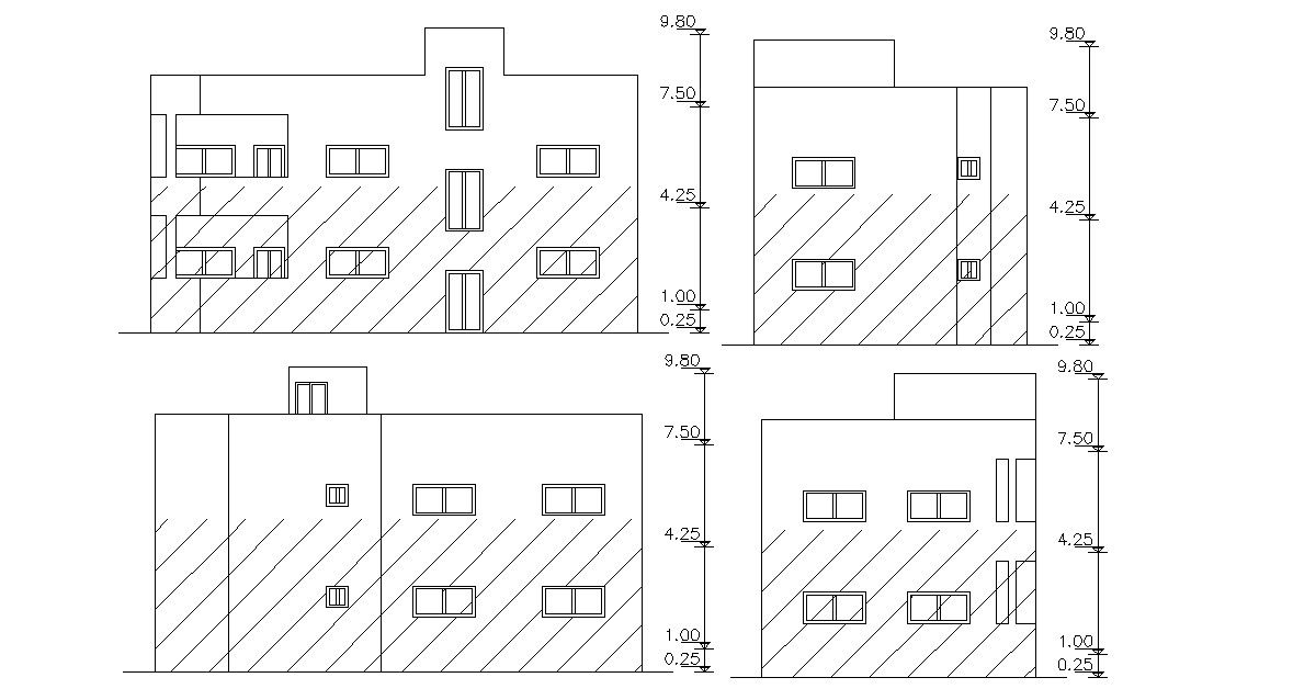 two floors elevations of residential building design with floor levels dimension details, some hatching design in elevations, doors and windows marking in elevation and other more details. free download this drawing and use it in a related project.