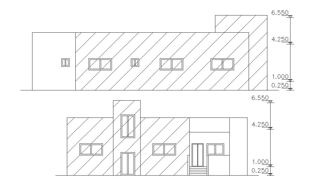 simple architectural elevations of residential building design with floor levels dimension details, some hatching design in elevation, doors, and windows marking elevation and other more details.