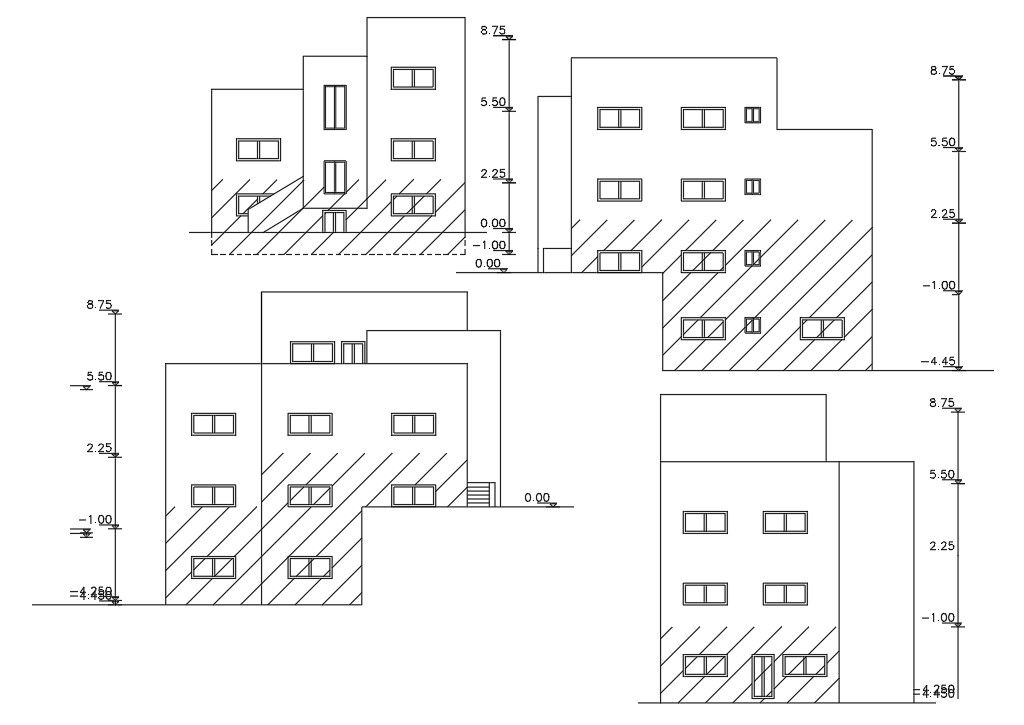 Architecture bungalow building elevation design which is from a number of different angle view elevation designs with dimension detail. also, its help to visualization bungalow outlooks design. download bungalow elevation design DWG file.