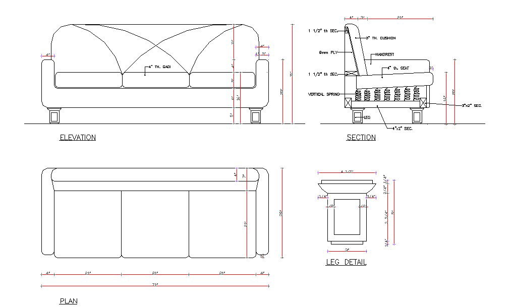 This sofa set Block detail in side elevation, Section, Leg detail, & all detail With all dimension include.