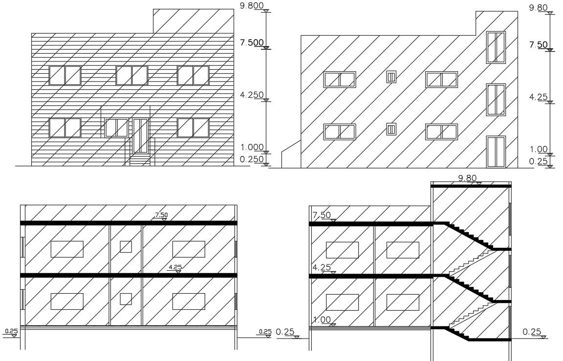 1600 square feet house building sectional elevation design that shows a front and rear view design, 2 storey floor level, door and window marking design. download DWG file of house building design AutoCAD drawing.