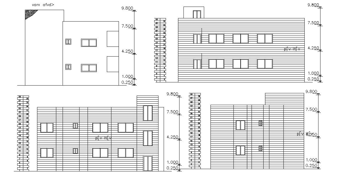 the simple architectural design of residential house building with floor levels dimension details, some hatching design in elevation, doors, and windows marking in it.this is the two-floor building design. free download this drawing and use it in a related project.