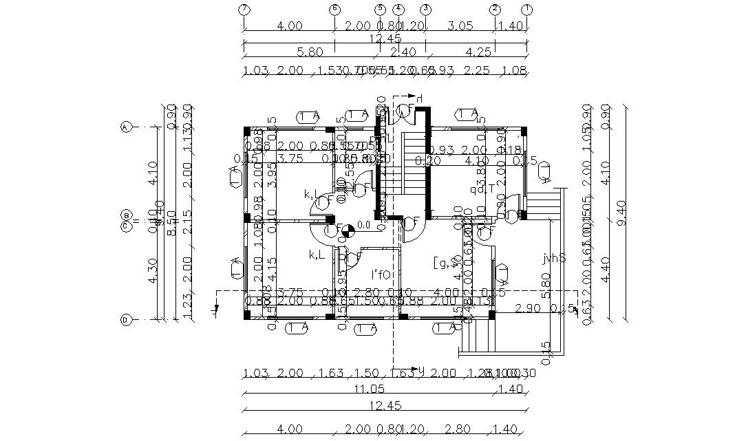 architectural working drawing plan of residential house design with centerline in the plan, structural column marking in the plan, doors, and windows making in it.many functions in this planning like the main foyer, drawing room, kitchen, bedrooms, toilets, stair which is outside open and other more details.