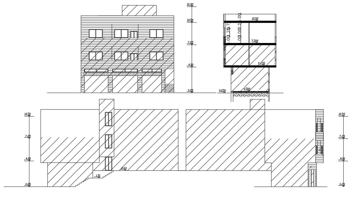2d CAD drawing of the apartment house and ground floor on retail shop building section and elevation design with dimension detail. download 2 BHK Apartment house building design DWG file.