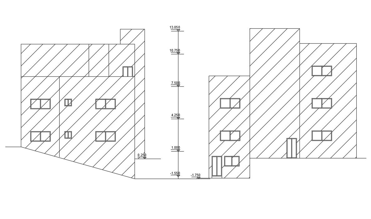 Download free DWG file house building rear and front elevation design with dimension detail that shows floor level detail and AutoCADhatching design.
