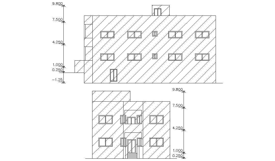 download this drawing which is related to architectural house design with floor levels dimension details, some hatching design in elevation, doors, and windows marking and other more details related to house elevation.