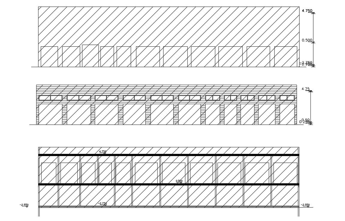 AutoCAD drawing of Commercial shop building sectional elevation design with dimension detail and has AutoCAD hatching design.