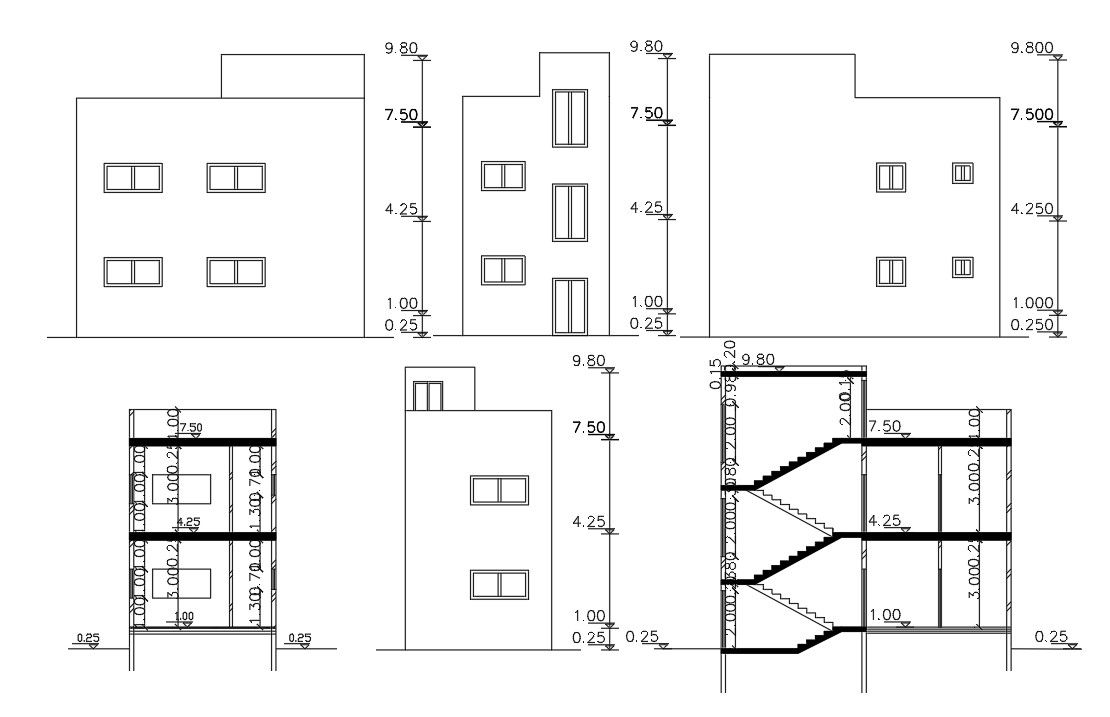 2 storey house building sectional elevation design that shows all side view design. Download 16 feet width and 32 feet depth of 2 storey house building design with dimension detail.