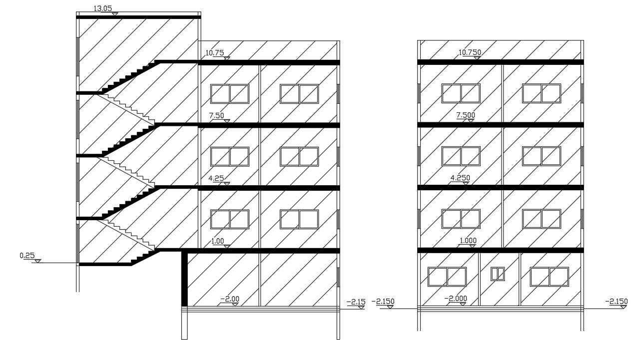 Download free DWG file of 3 storey apartment section drawing that shows a front and side view with standard staircase and slab design.