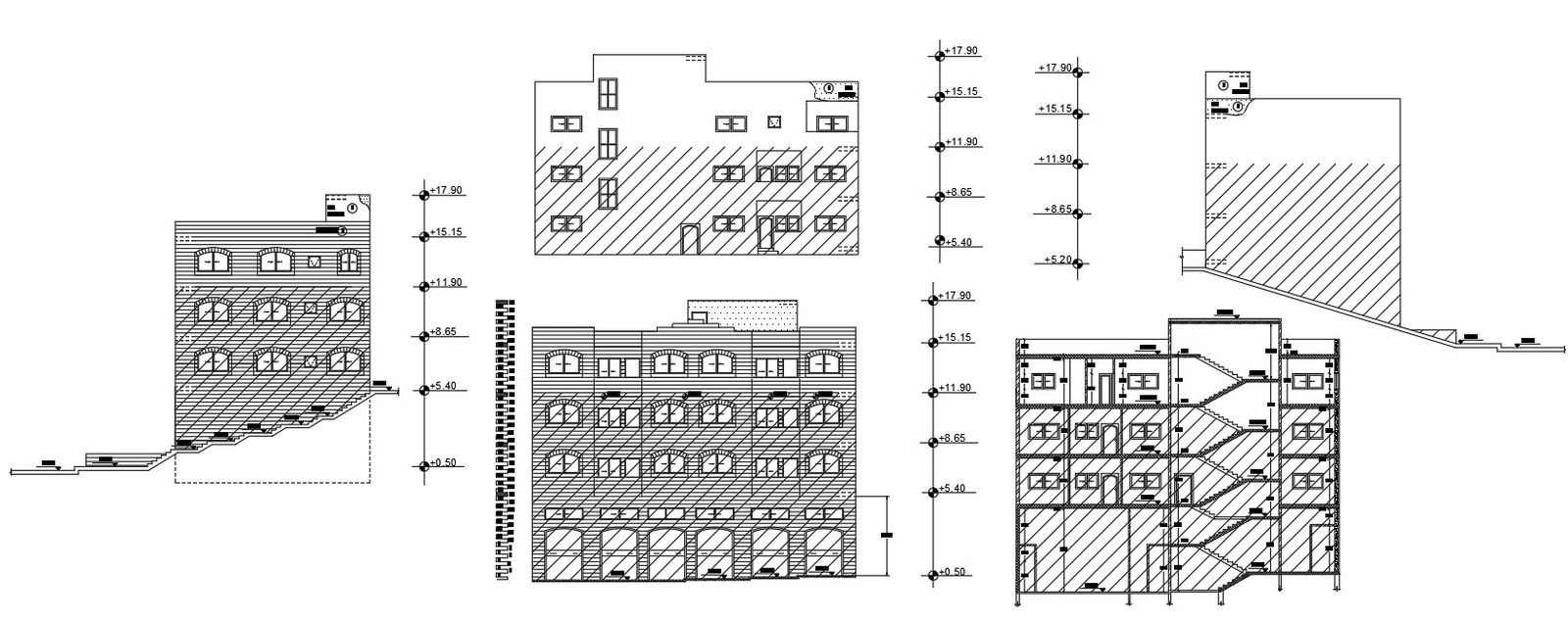 Traditional apartment building section and elevation design include different floor levels dimensions, working drawing, plantation, door and window marking detail. also has a shop on the ground floor and top floor house plan. this drawing is the AutoCAD software 2020 file format.