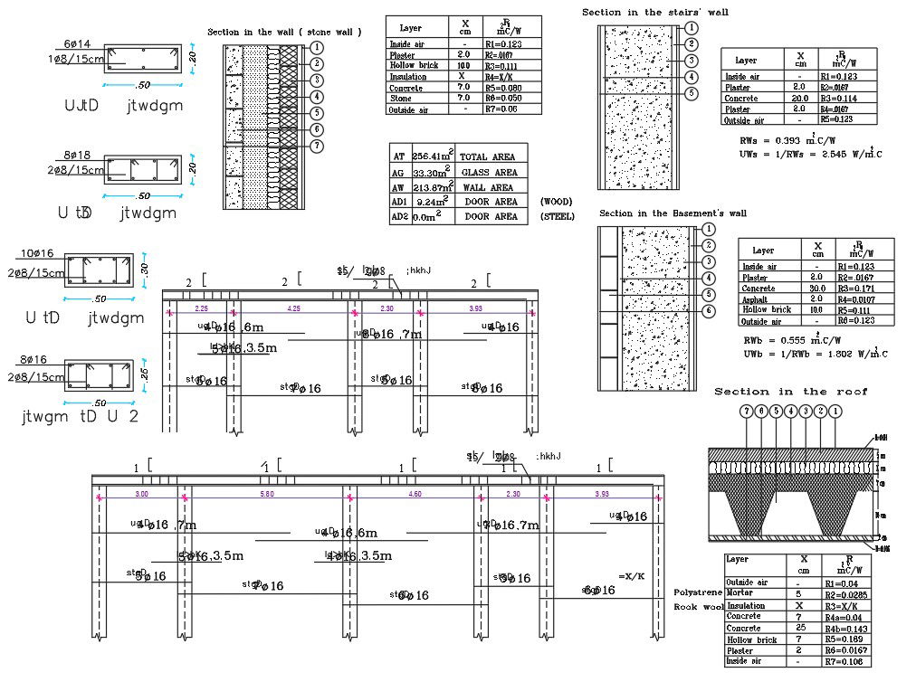 download free DWG file of wall and roof section drawing has insulation detail that shows paster, concrete, stone, and hollow bricks count description detail.