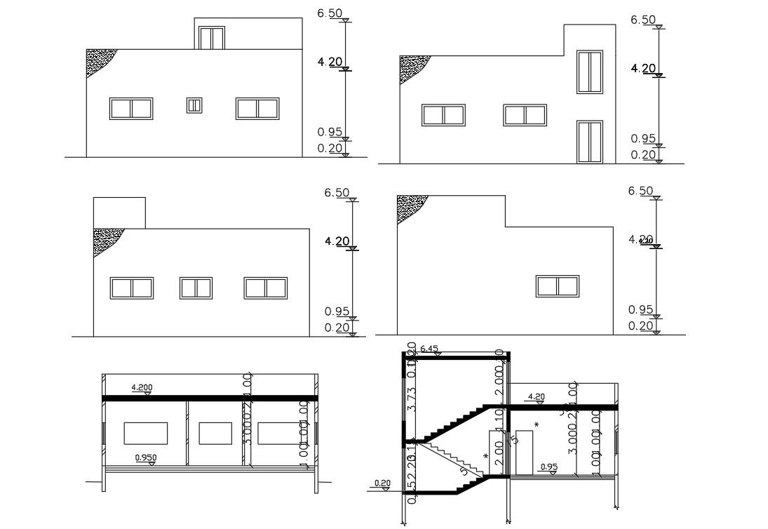 The architecture 800 sq ft house building section and elevation design that shows single storey floor level, wall section and dimension detail. download one storey house building design DWG file.