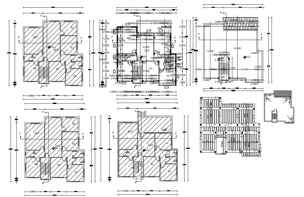 AutoCAD house architecture ground floor and first-floor plan design includes a spacious 7 bedrooms, drawing, kitchen, dining area and living room with all dimension detail. also has the stairs come up on the terrace and the main entry porch sloping roof design. download house with working plan design DWG file.