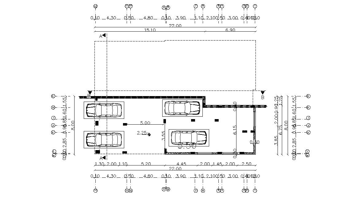 A drawing layout include car parking details, column and wall details, section line, centerline, etc. download AutoCAD file.