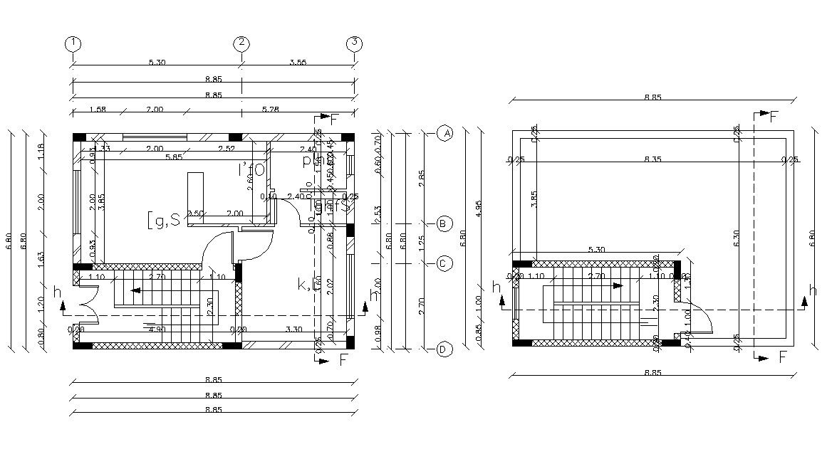 A drawing show the ground floor and terrace floor plan which provide centerline, section line, column, door and windows details with dimension details, and floor size is 8.85 X 6.80 meter. download AutoCAD file.