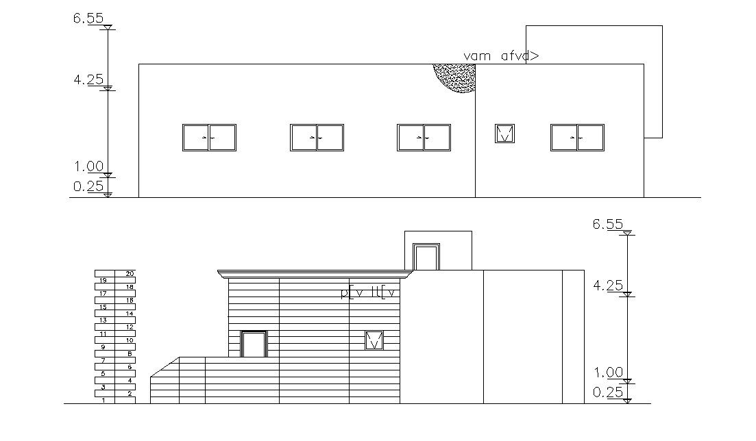 The drawing elevation layout include floor level, plinth level 0.25, elevation height 6.55, door and window. download one storey elevation layout AutoCAD file.