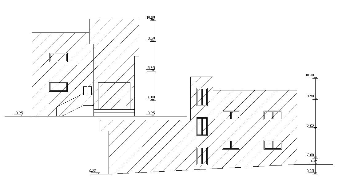 The architecture drawing elevation layout provide floor level, plinth level 0.25 meter, elevation height 10.80 meter, hatching, window and door. download AutoCAD format.