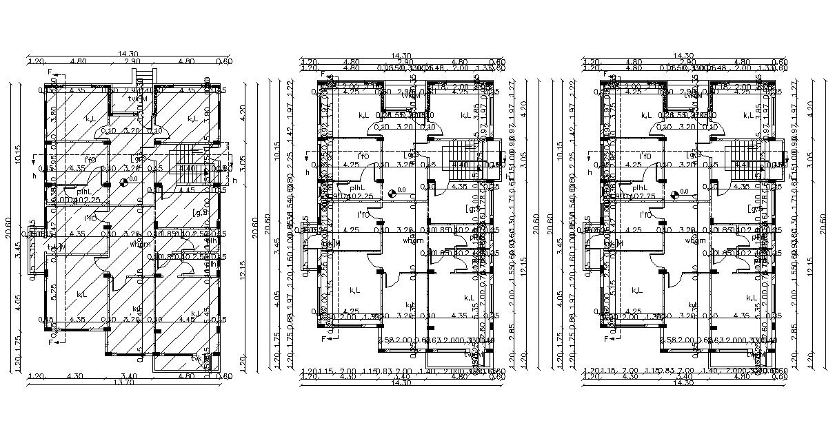 2d drawing floor plan is 14.30 X 20.60 meter and arrangement of bedrooms, kitchen, washroom, toilet, pooja room, balcony and drawing room. download CAD file.